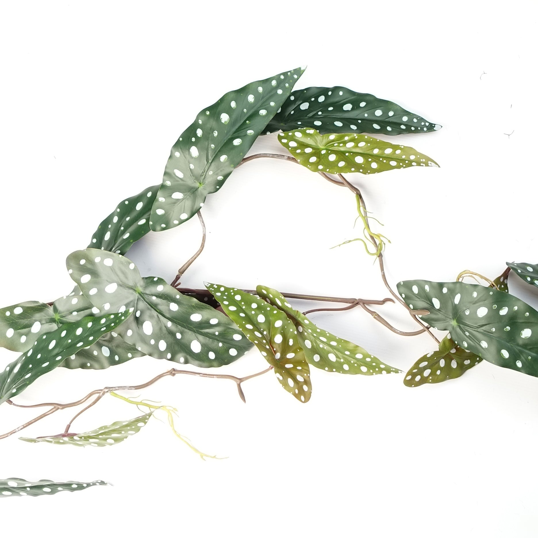 Realistic trailing plants in the style of Begonia Maculata with beautiful spotted leaves. These can also be combined with other plants for a larger display. No planter is included with this plant. Overall this measures 110cm x 30cm x 20cm as arranged in our photos.