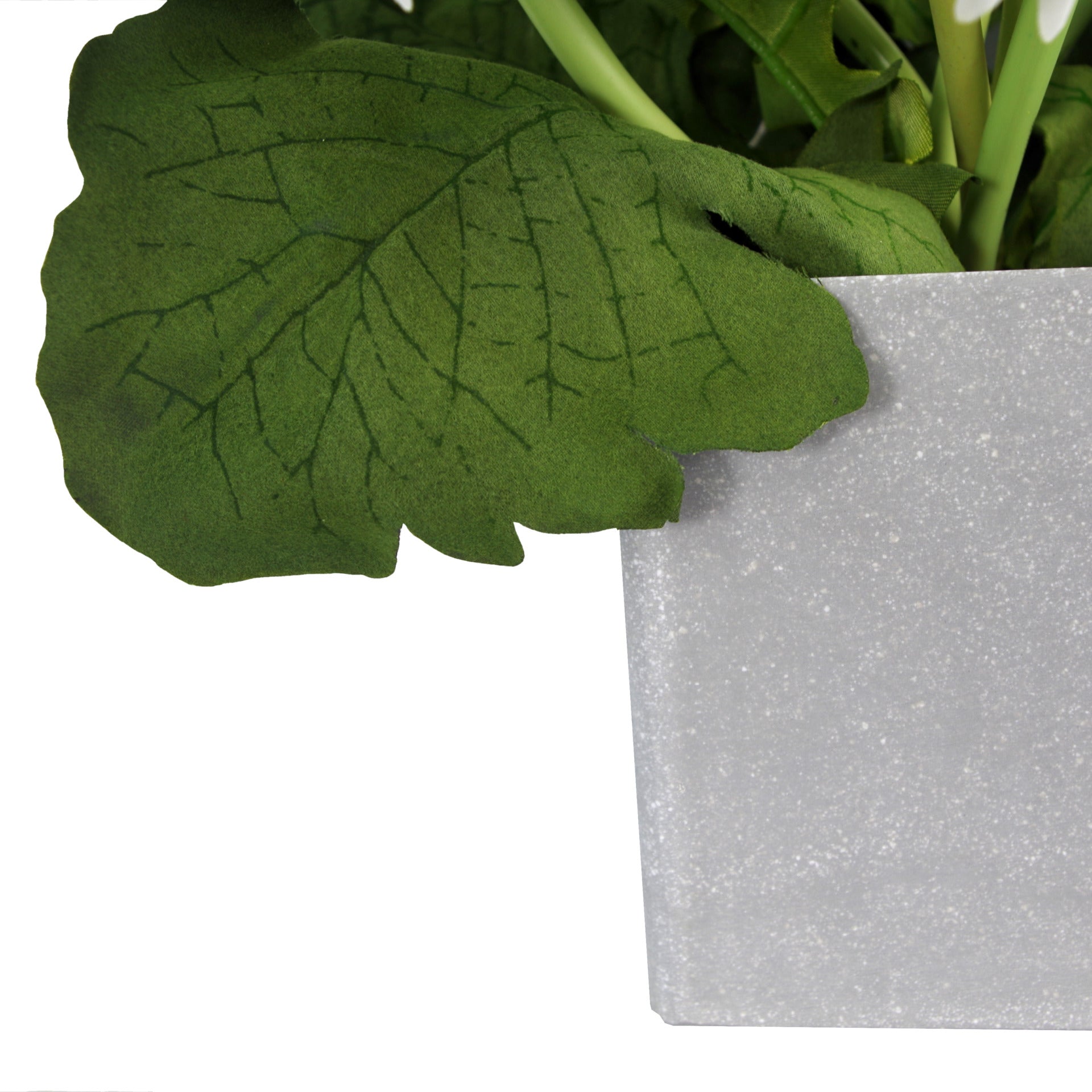 Potted daisy with 5 flowers 2 buds 9 leaves and a grey painted terracotta pot . Overall size 33x30x30cm. This product is designed for indoor use only. Petals and leaves are fabric. Stems are wired and can be arranged. Pot measures 15cm (w) x 16cm (h).