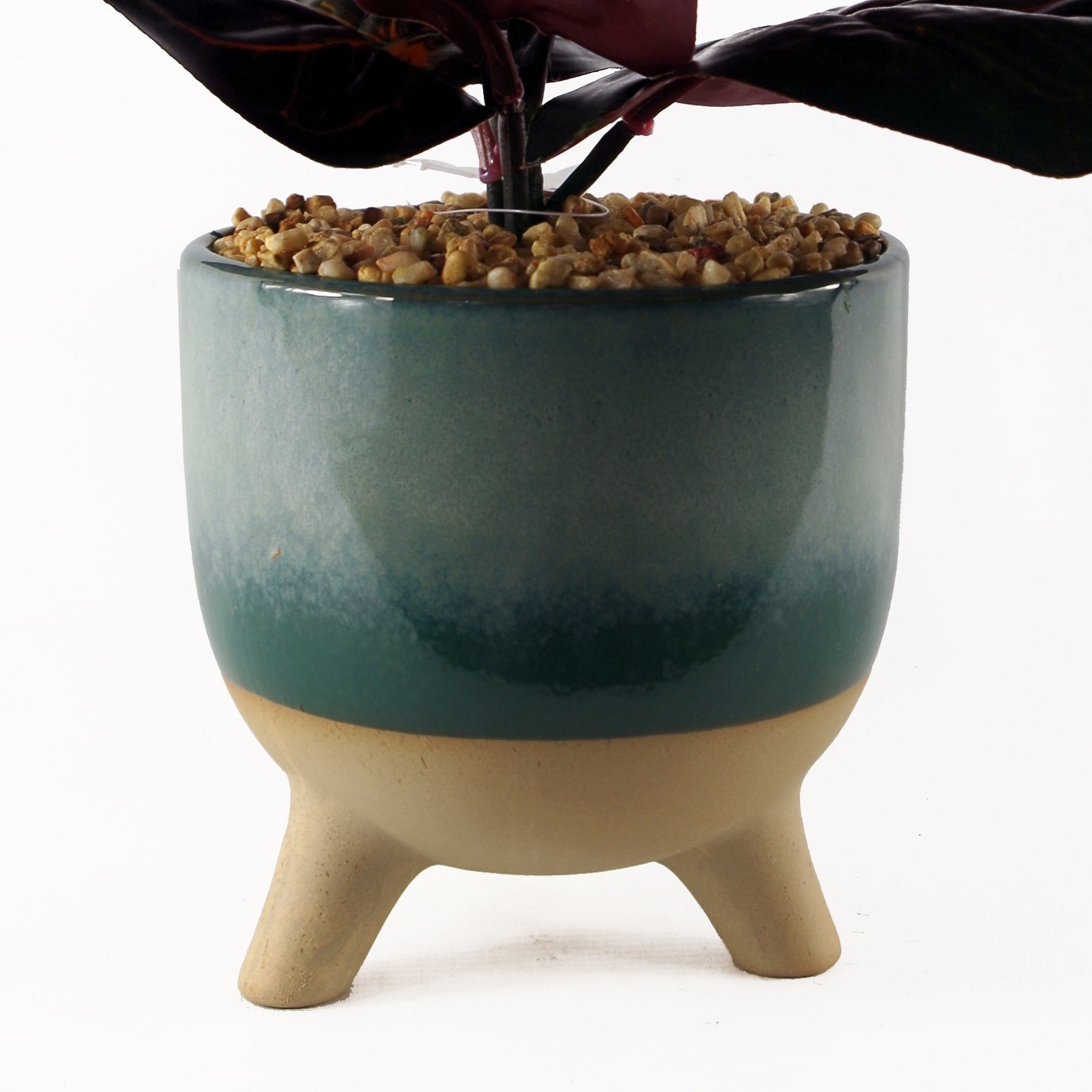 Unusual statement plant in a three legged ceramic planter. Plastic artificial ficus plant in a decorative ceramic planter. As arranged in our photos it measures 35cm x 30cm x 30cm overall. The decorative ceramic planter measures 13cm (h) x 13cm (w). The leaves are plastic. The ceramic decorative planter is topped with fixed pebbles for an attractive- low maintenance finish.