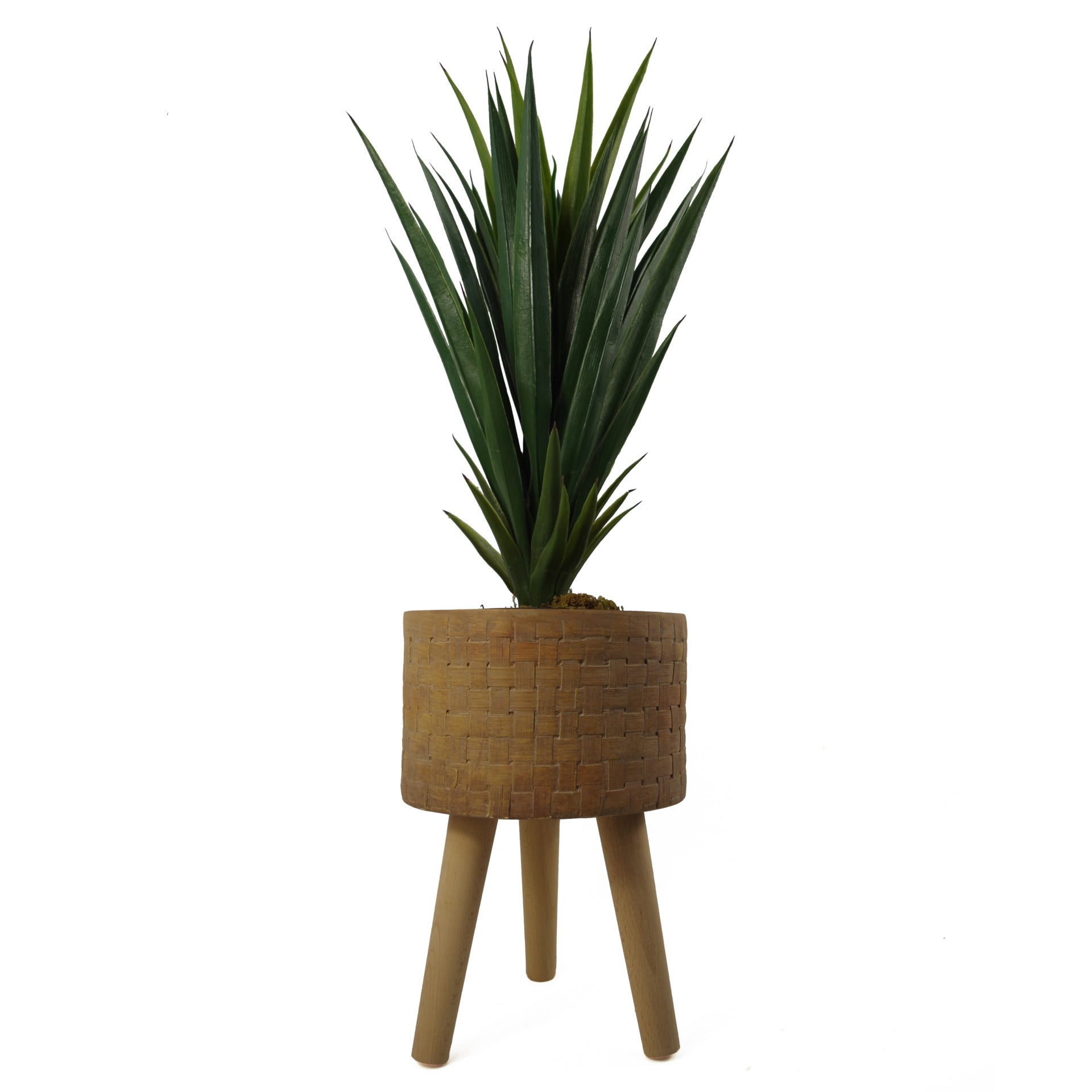 This planter is made from fibreglass composite but is an extremely convincing replica of a woven basket planter. The advantage of this is that it is waterproof, watertight and will not go mouldy when exposed to water for long periods of time like real seagrass or woven baskets making this suitable for humid locations like bathrooms but also for watering real plants. Measures 36cm x 25cm Woven Effect fibreglass composite Planter. Large fibreglass composite planters, hand finished in a rustic style. Available in a range of designs and sizes. Large planter ideal for either artificial plants or real ones. Designed for indoor use but can be used outdoors in a sheltered position, we recommend protecting from extremes of weather. Overall size: 25 x 25 x 36cm. At the widest point this pot measures 25cm. The top rim has a diameter of 25cm. The inner hole diameter is 21.5cm, any of our plants with starter pots smaller than this and all our bare stem plants will fit perfectly inside this planter. Legs measure 20cm. Top planter measures16cm x 25cm. Please see images for a size diagram. No drainage holes so suitable for watering indoor plants. Intentional Rustic finish. Comes requiring minor assembly by screwing on legs - the legs are double threaded so by twisting the bolt the opposite direction you can extend or reduce the length of the screw part that fits into the planter. Material: fibreglass composite. Legs: Wood
