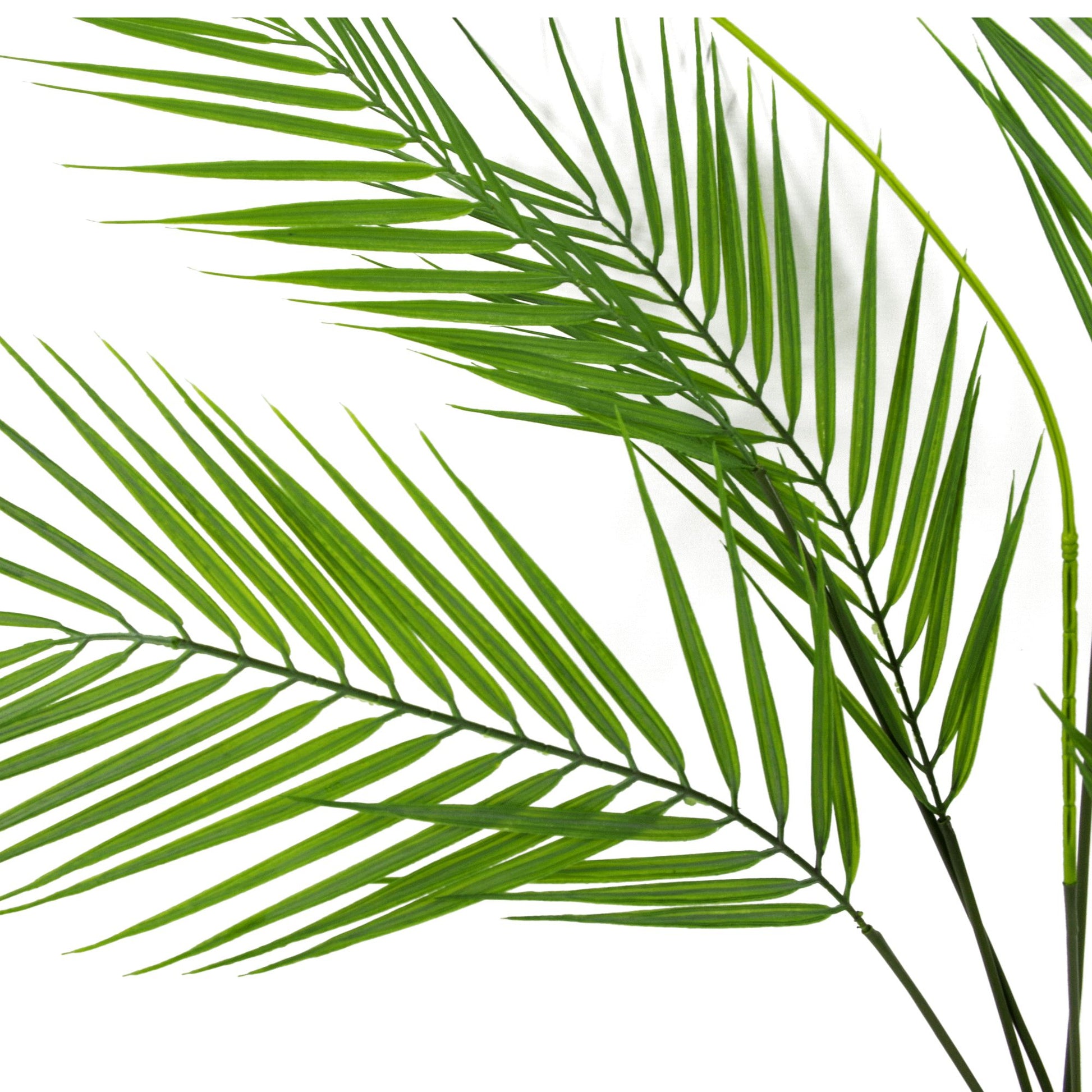 75cm Artificial Palm - Unpotted 6 Leaves 75cm from base to leaf tips. 6 realistic leaves and one green stem designed to look like new growth Wired stems so fully arrangeable to suit your space. Bare stem plant - no pot included- ready for you to pot or use in displays. We have these unpotted palms available in 75cm and 118cm sizes - if you are looking to create your own palm displays these look particularly nice when combined - see the example photograph of two bare stem palm plants potted into one of our gold planters. You can combine any number of these to make large and impressive tropical displays.