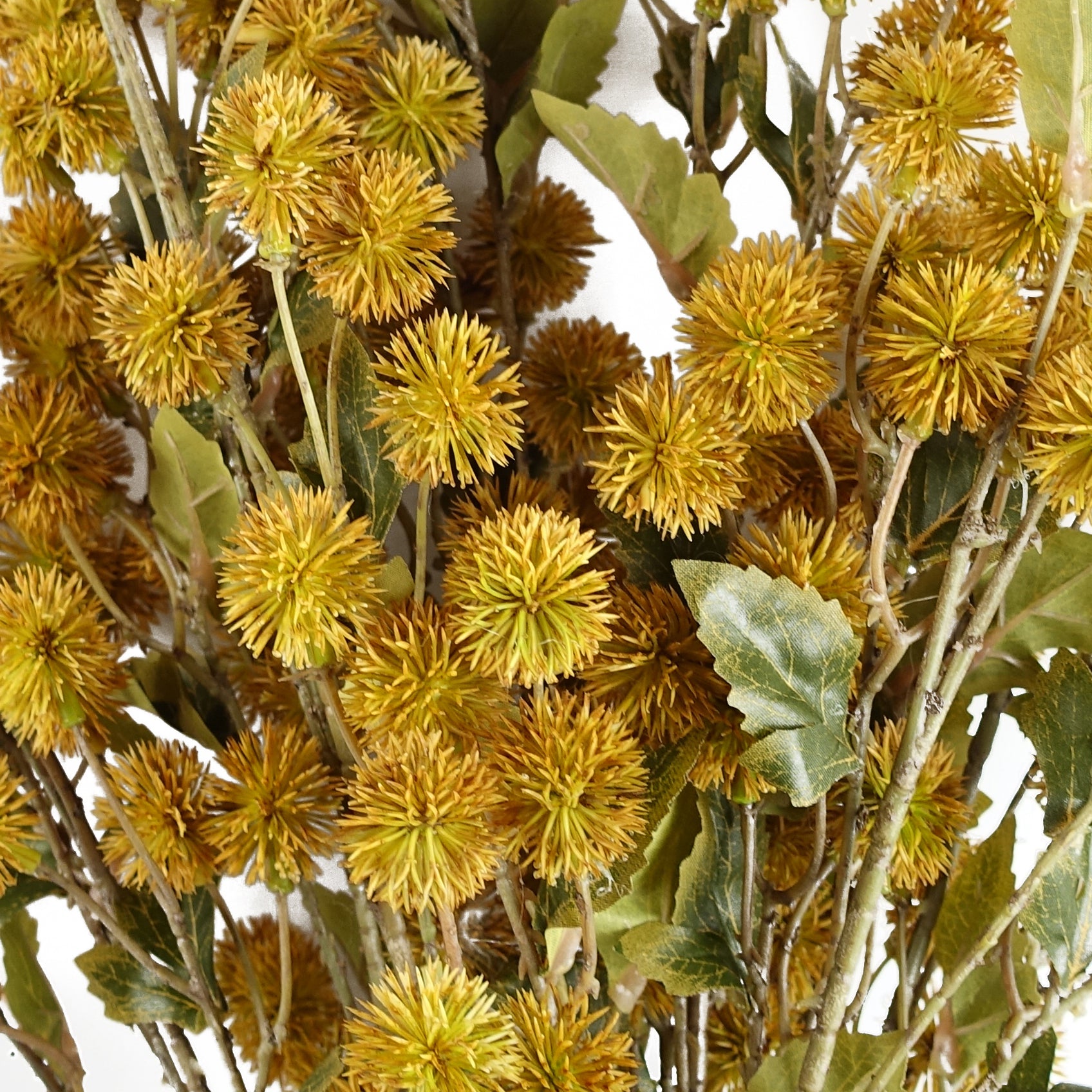 Realistic Realistic craspedia stem with plastic flowers and wired shapable stem. Leaves are silk. Perfect for adding a splash of colour to your floral arrangements. Can be used to make arrangements with our other artificial flowers or as decorations on their own. Each stem measures 85cm overall height x 25cm. These are easy to cut down shorter using a pair of wire cutters if required. Some of our photos show vases to give an idea of size and possibilities for arrangement, but no vases or planters are included with this foliage.