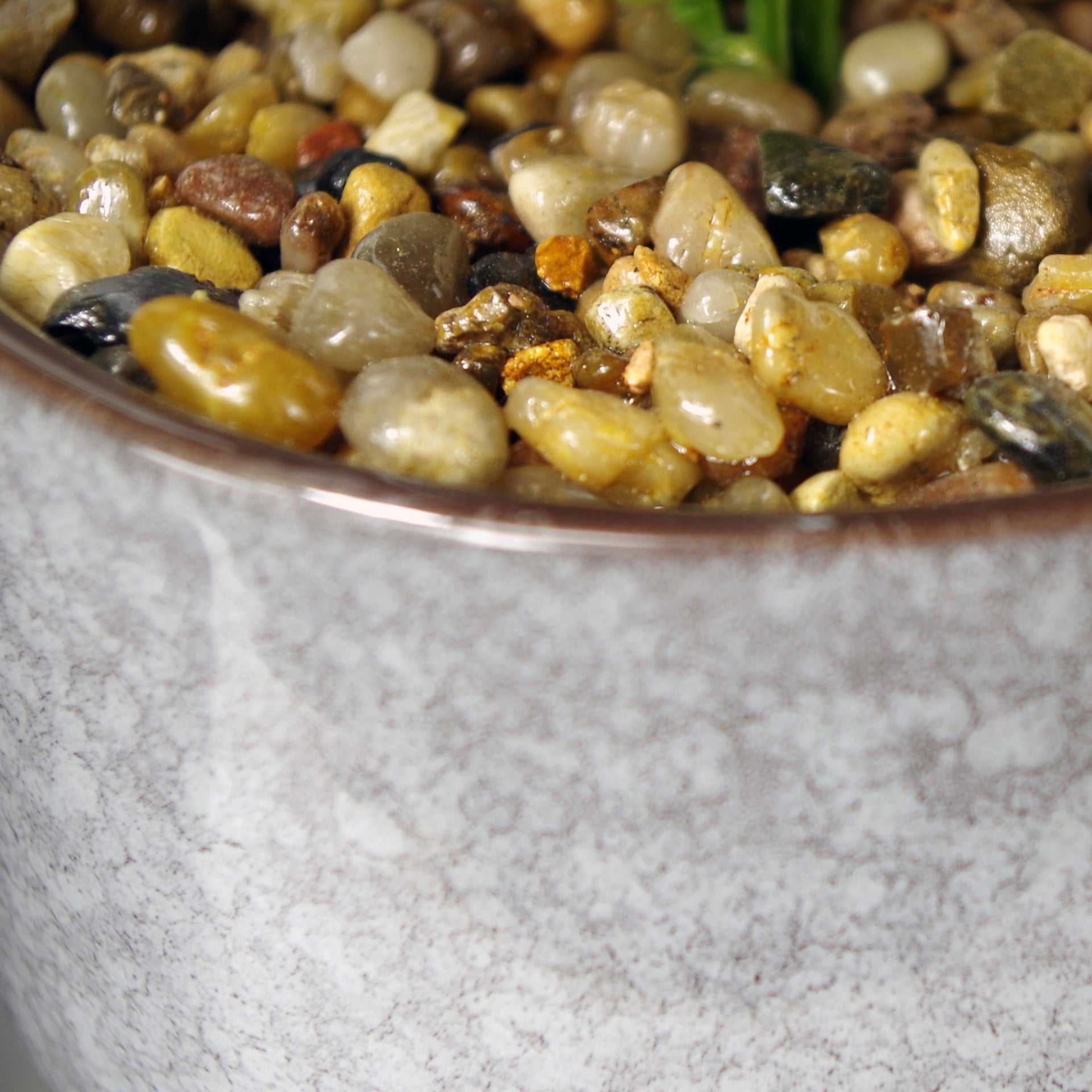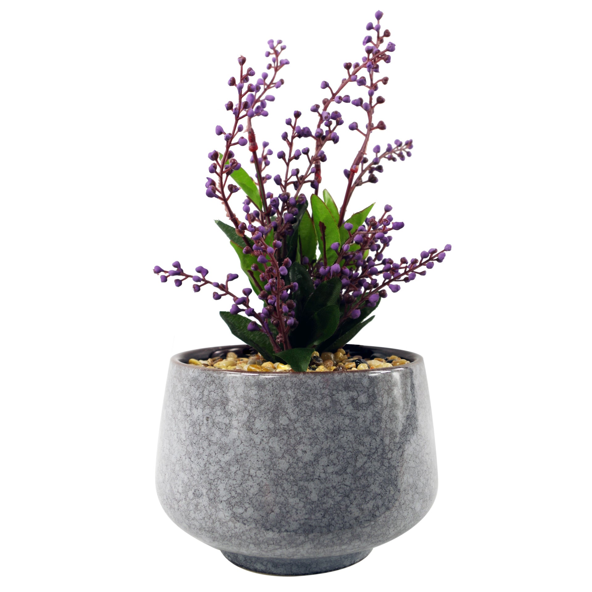 Ceramic Tall Blue Planter with Artificial Purple Vitex Negundo Plant. Overall measurements: 28cm (h) x 14cm (w) x 14cm (d). Ceramic planter measures: 14cm (w) x 10cm (h) approx. Plant comes fully potted in the small ceramic planter shown. This is a robust tall design which looks fantastic on a desk. Pebbles are fully fixed and won't come loose. Ready to display. Available with a choice of plants.