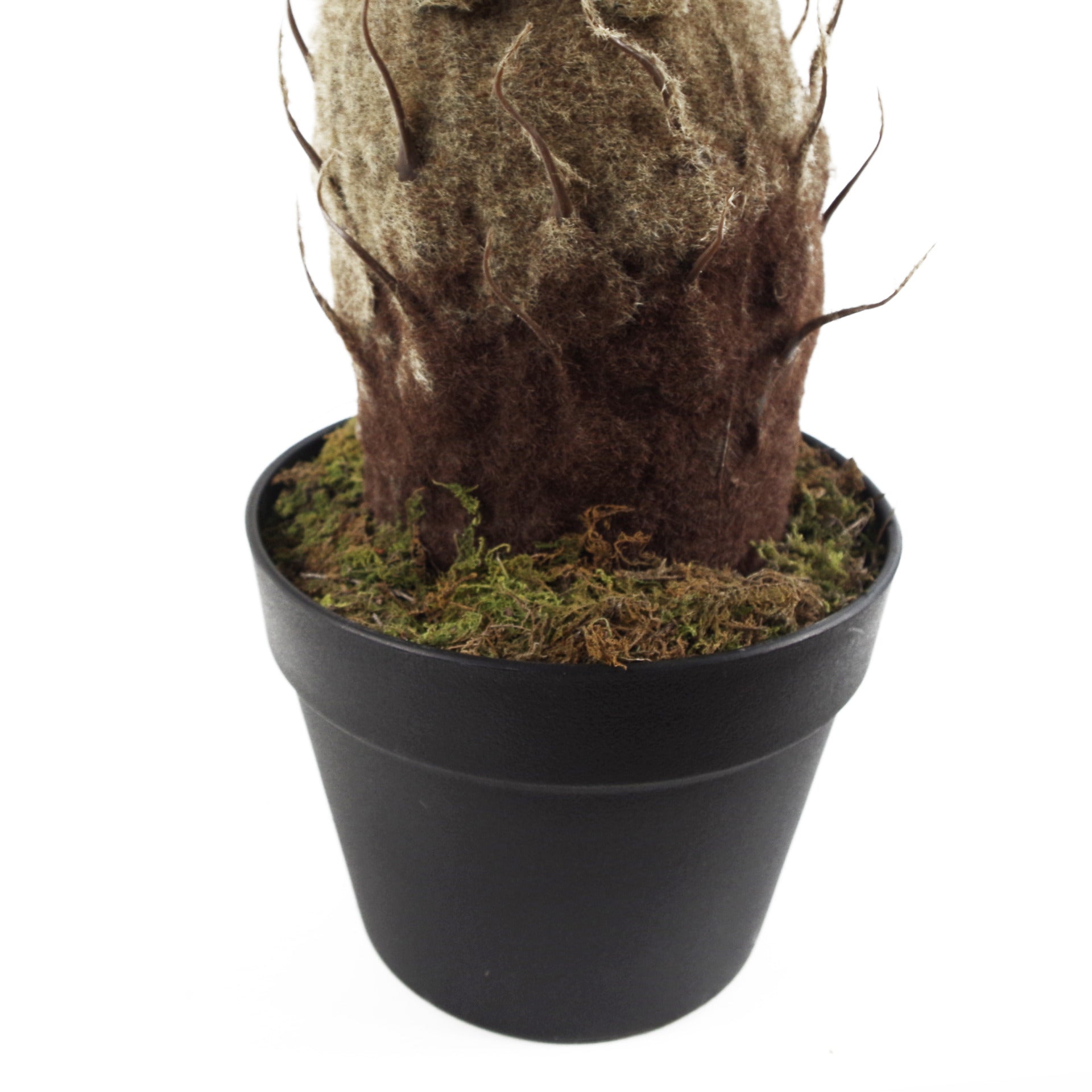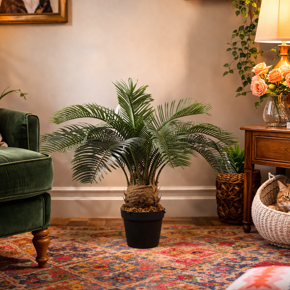 With its modern, minimal shape andgreen fronded leaves this artificial Cycas Palm plant is a popular choice for modern interiors. This Cycas plant has a tropical look with authentic trunk detailing and realistic leaf formation arrangement. A bold and appealing choice suitable for both residential and commercial applications. This artificial plant stands 60cm high, width 60cm and depth 60cm. Plastic pot measures 16cm (d) x 13cm (h) approx. It is highly realistic with botanically accurate foliage. It comes potted in a plain black plastic pot and is ready to display. You can easily put this inside a larger planter if you wish - these look particularly nice in our metal stand planters (available separately).