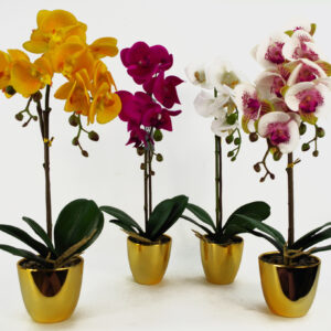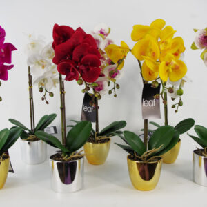 Realistic artificial orchid plant with real touch leaves, glued fixed gravel base, potted in a plastic decorative pot as shown. 6 real touch flowers. Pot is plastic and measures 9cm (h) x 9cm (w) Overall height as arranged in our photos 46cm. Stems are wired and this plant can be arranged to your requirements.