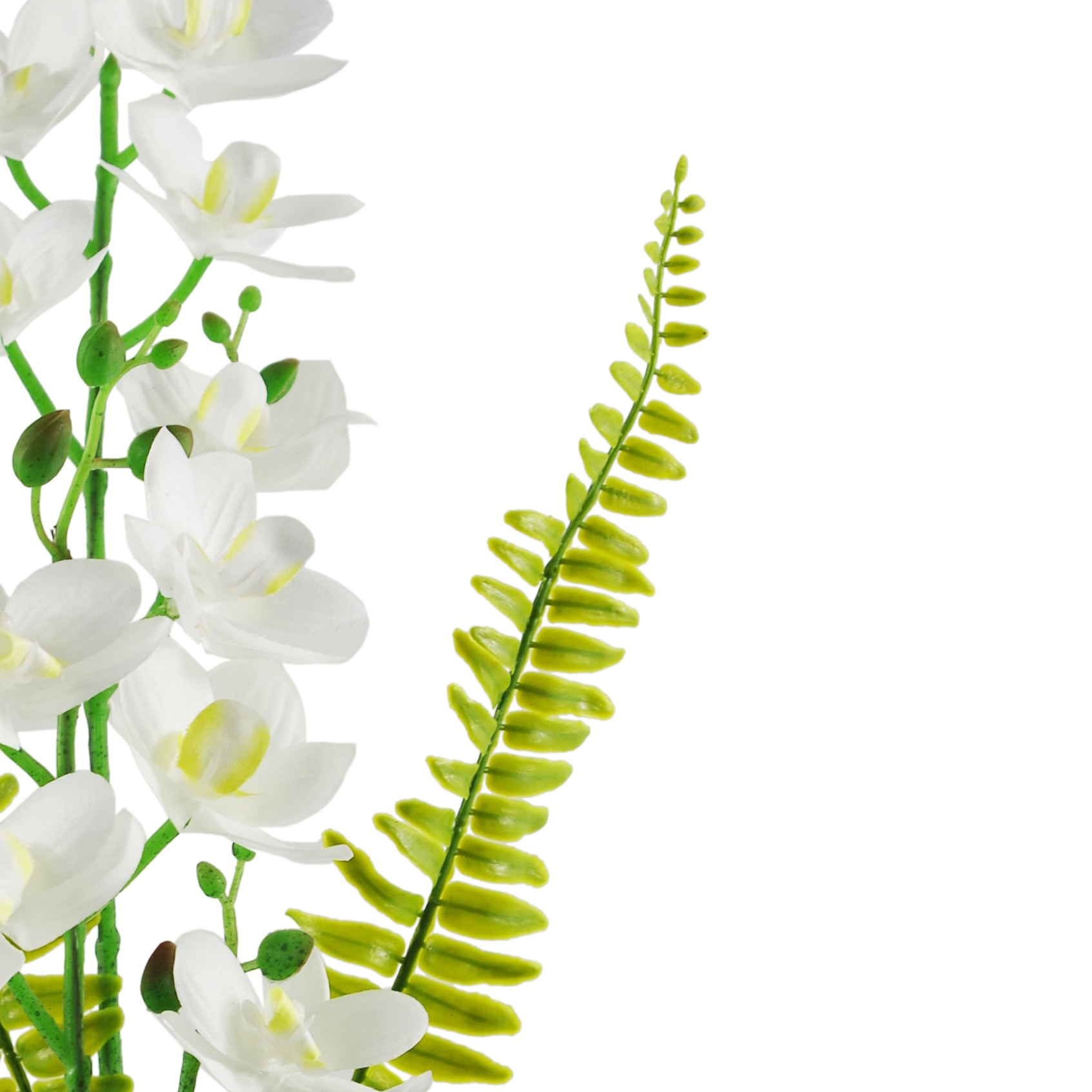 48cm White Artificial Orchid in Metal Planter. Part of our range of realistic orchids, this plant looks great on a desk or window sill. It is fixed into the supplied metal planter and is ready to display.