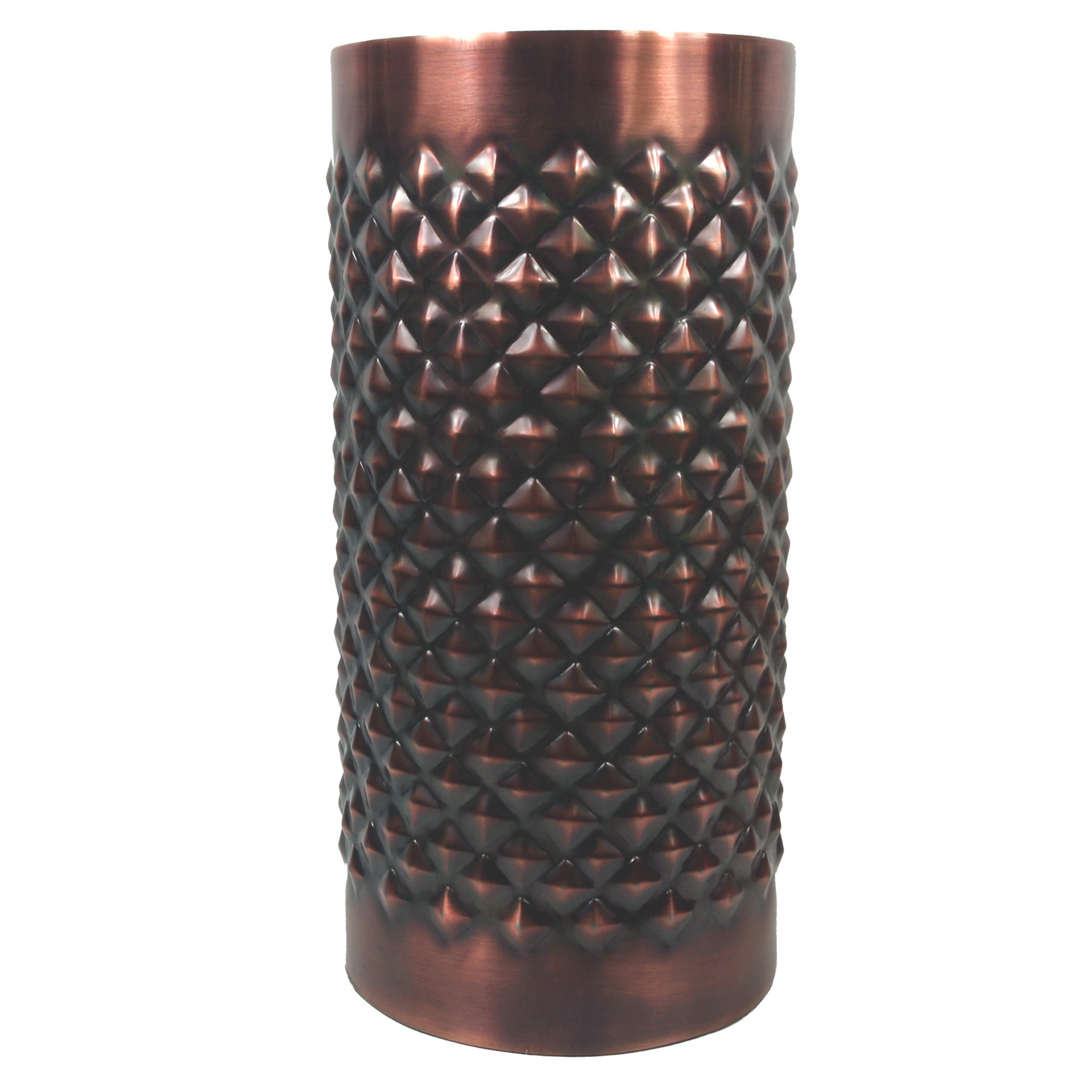 Diamond Metal Vase – Antique Copper. 15cm diameter, 31cm height. 11cm hole diameter at the top. These are all hand made in a rustic finish with intentional minor imperfections. As a hand made product there are minor differences from one to another and each one is slightly unique.